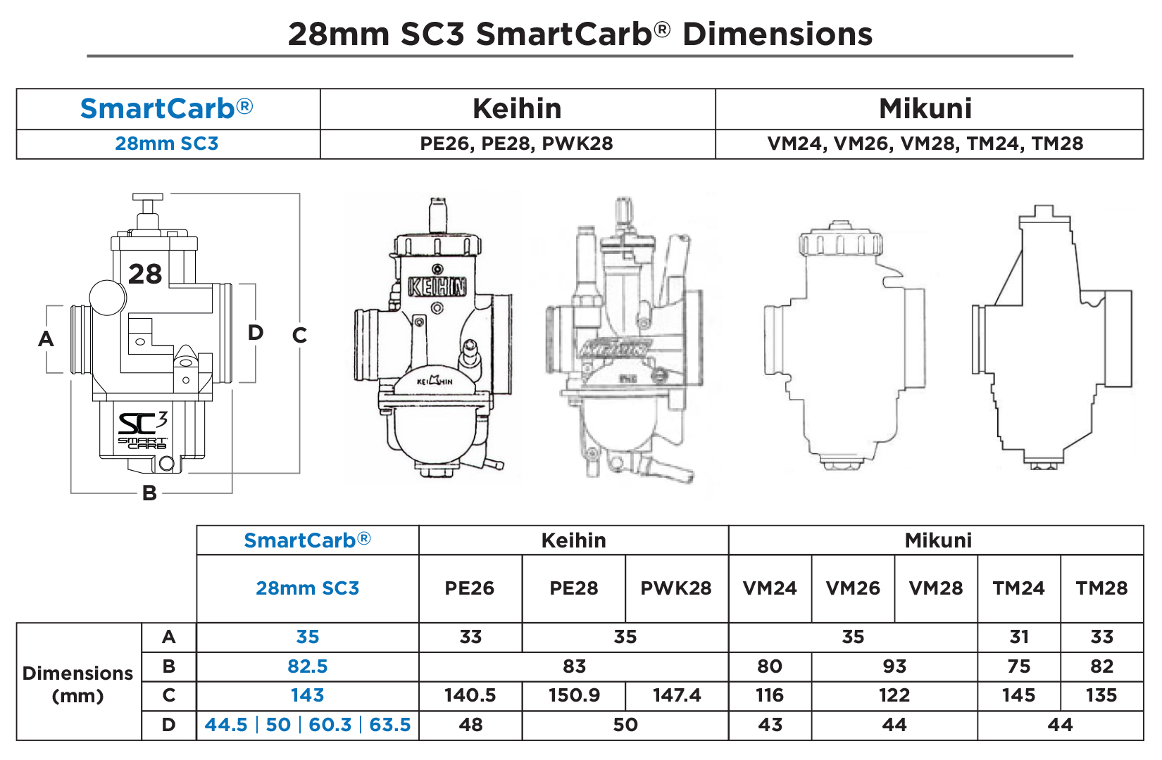 The all-new 28mm SC3 model SmartCarb is designed to replace conventional, spigot mounted carburetors in 65-300cc 2-stroke applications and in 100-250cc 4-stroke applications, offering unbeatable performance and incredible ease of use. It is a direct fit in applications originally equipped with Keihin PWK 28mm and Mikuni VM or TM series carburetors of similar size. In general we recommend replacing size-for-size.